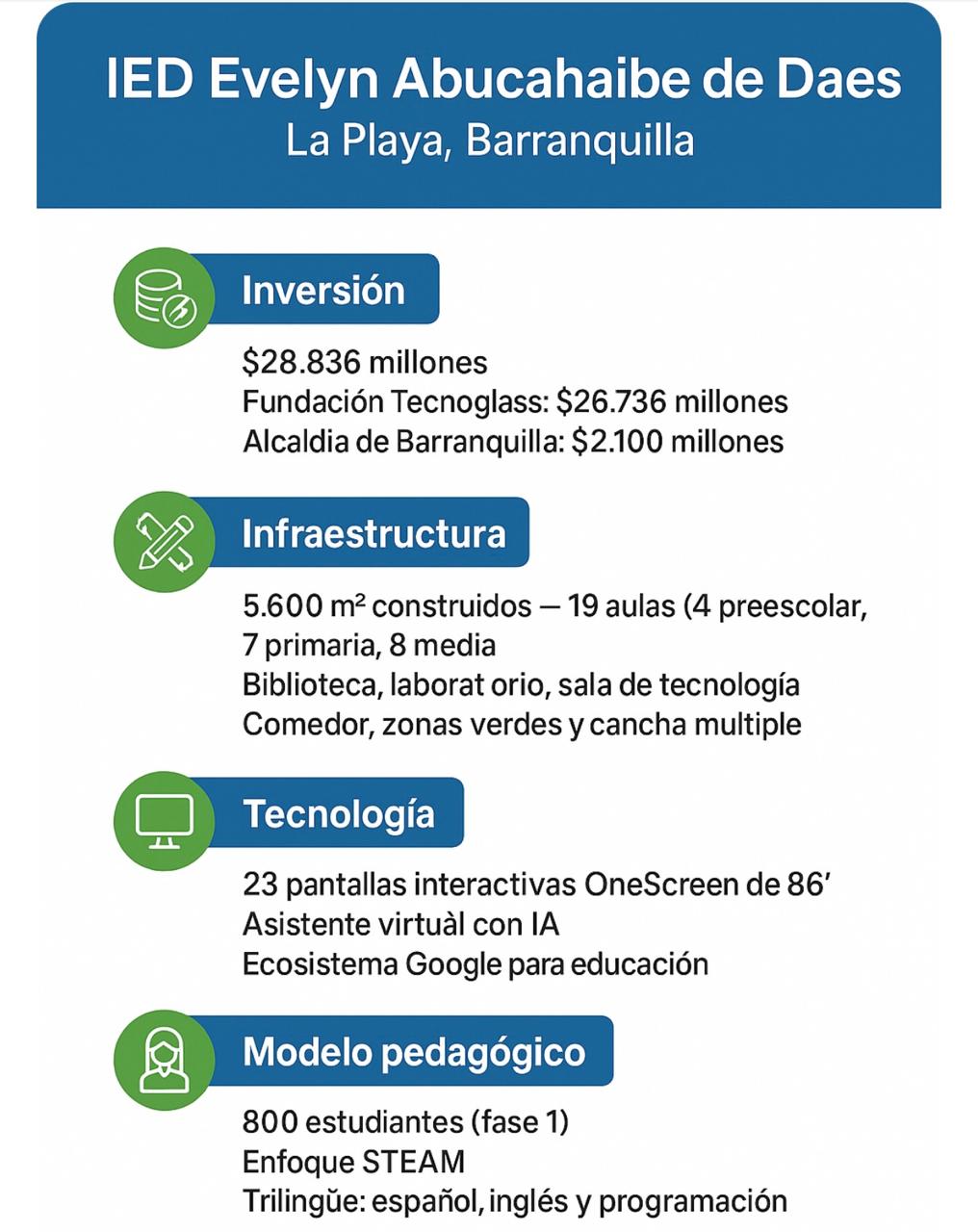 La capital del Atlántico estrenó una institución educativa de última generación en el corregimiento La Playa. Se trata del colegio Evelyn Abuchaibe de Daes que abre sus puertas a 800 estudiantes bajo un modelo STEAM y trilingüe, resultado de la alianza entre la Fundación Tecnoglass y la Alcaldía de Barranquilla.