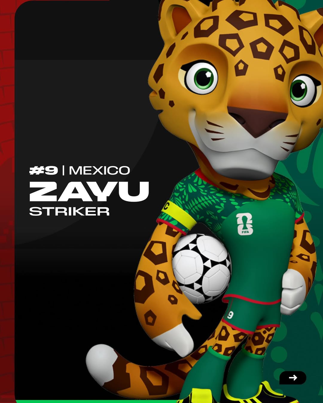 En el caso de México, Zayu porta un uniforme verde y el número 9, símbolo asignado usualmente a los jugadores en la posición de delantero. Su nombre, según información divulgada por los organizadores, evoca ideas asociadas a unidad, fortaleza y entusiasmo.