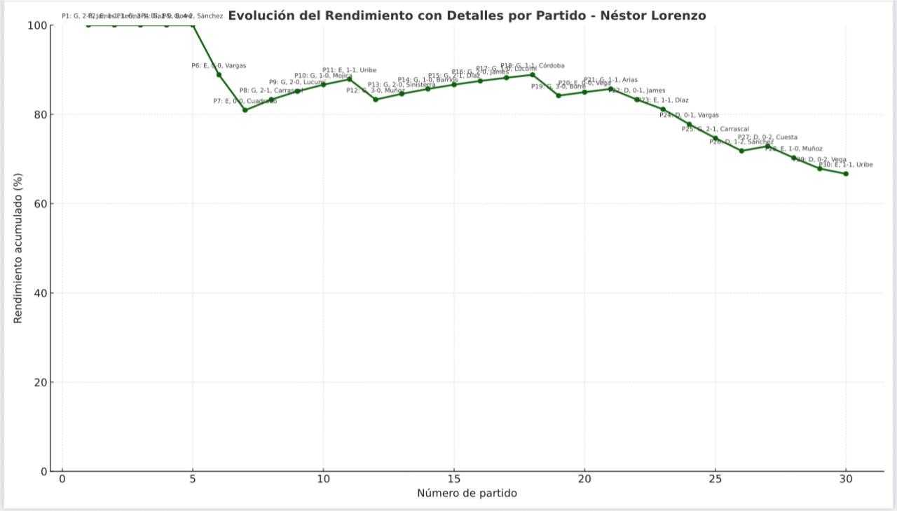 En resumen, el balance estadístico de Néstor Lorenzo hasta la fecha evidencia una gestión con altibajos marcados: una primera fase de alto rendimiento e invicto, seguida por una tendencia descendente en la segunda etapa.