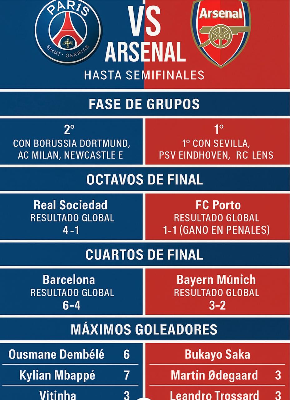 Por su parte, el Arsenal, que busca su primera final de Champions desde 2006, enfrenta el desafío de remontar un marcador adverso fuera de casa, algo que nunca ha logrado tras perder la ida en casa en competiciones europeas.