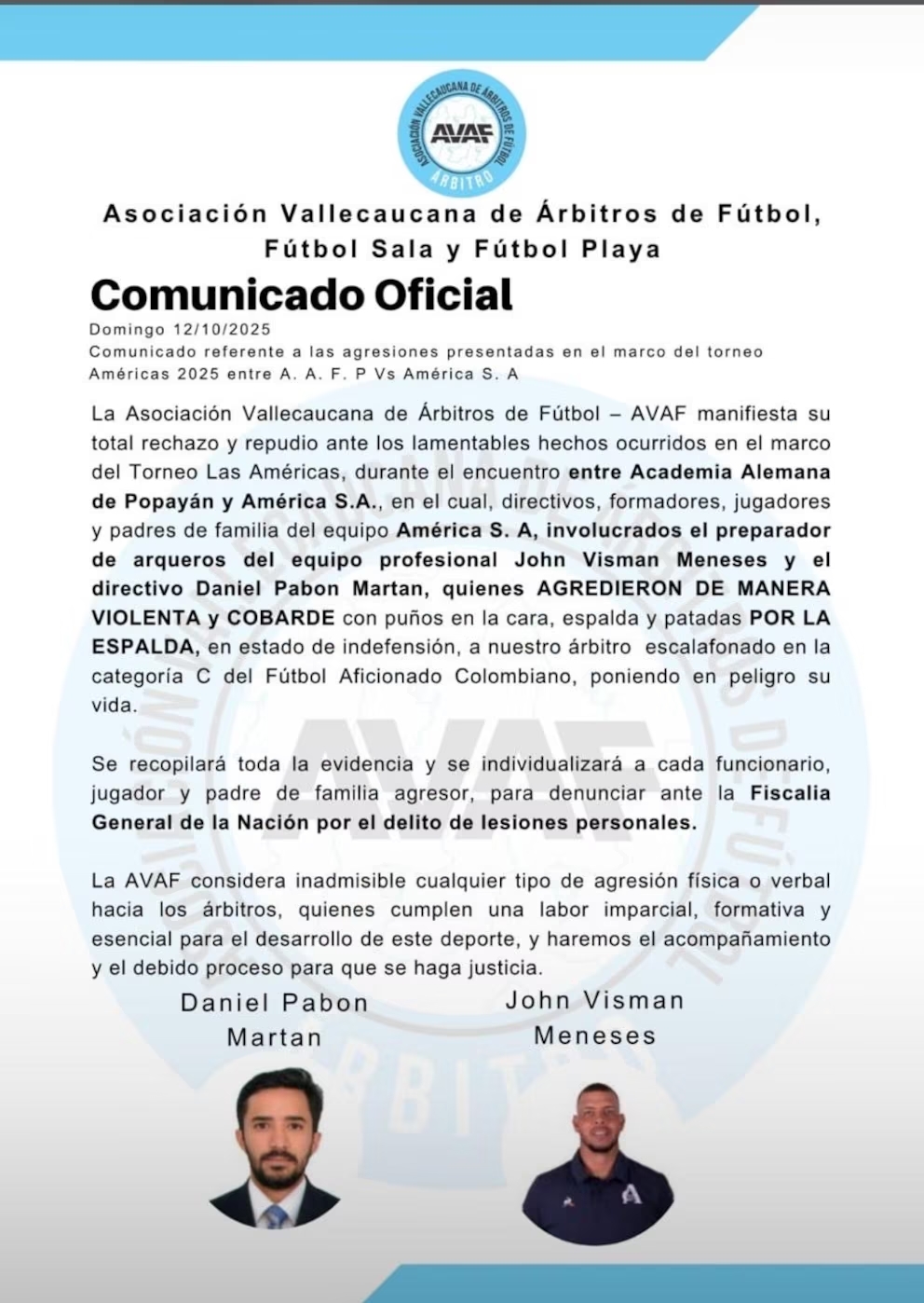 La Asociación Vallecaucana de Árbitros de Fútbol (Avaf) denunció oficialmente una agresión contra el equipo arbitral durante un partido del torneo Américas, disputado entre el América de Cali sub-17 y la Academia Alemana de Popayán, en el que señala a dos integrantes del club escarlata como responsables directos del ataque.