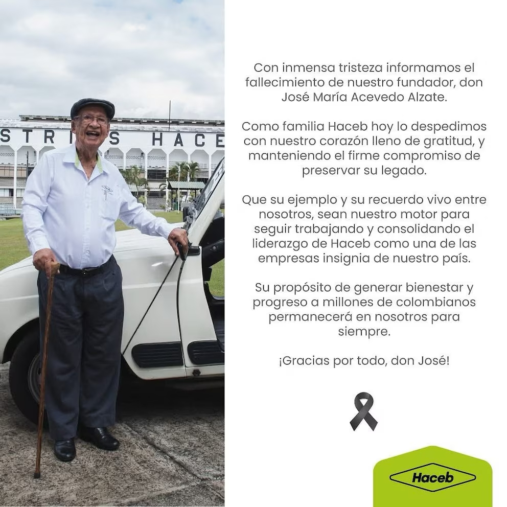 La compañía confirmó su fallecimiento a través de un comunicado en el que expresó su gratitud hacia quien fue su creador y guía durante más de ocho décadas. “Con inmensa tristeza informamos el fallecimiento de nuestro fundador, don José María Acevedo Alzate. Como familia Haceb hoy lo despedimos con nuestro corazón lleno de gratitud, y manteniendo el firme compromiso de preservar su legado”, señaló la empresa.
