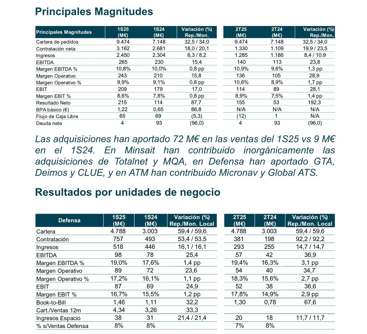 El margen EBITDA de los seis primeros meses se situó en el 10,8% frente al 10,0% del mismo periodo de 2024, con un crecimiento en términos absolutos del 15%. Esta mejora se explica principalmente por el mayor aumento de ingresos registrado en las divisiones con mayor rentabilidad operativa, Defensa y ATM, así como por la propia mejora de la rentabilidad en Defensa, Movilidad y Minsait.