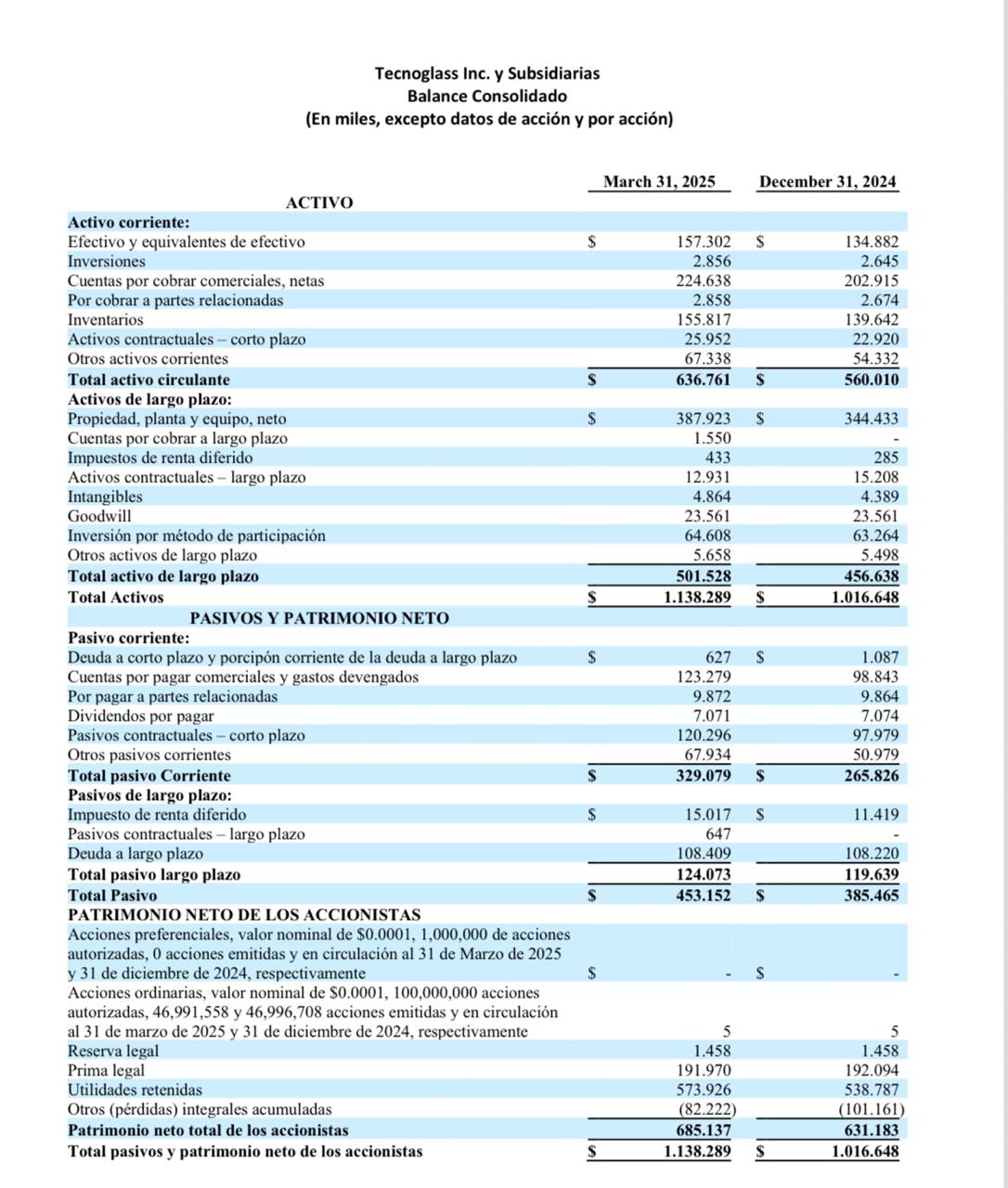 Tecnoglass, Inc. (NYSE: TGLS) (“Tecnoglass” o la “Compañía”), empresa líder en la producción de vidrio arquitectónico y ventanas de aluminio y vinilo de alta calidad, asociados a la industria global de la construcción residencial y comercial, reportó hoy los resultados financieros del primer trimestre finalizado el 31 de marzo de 2025.