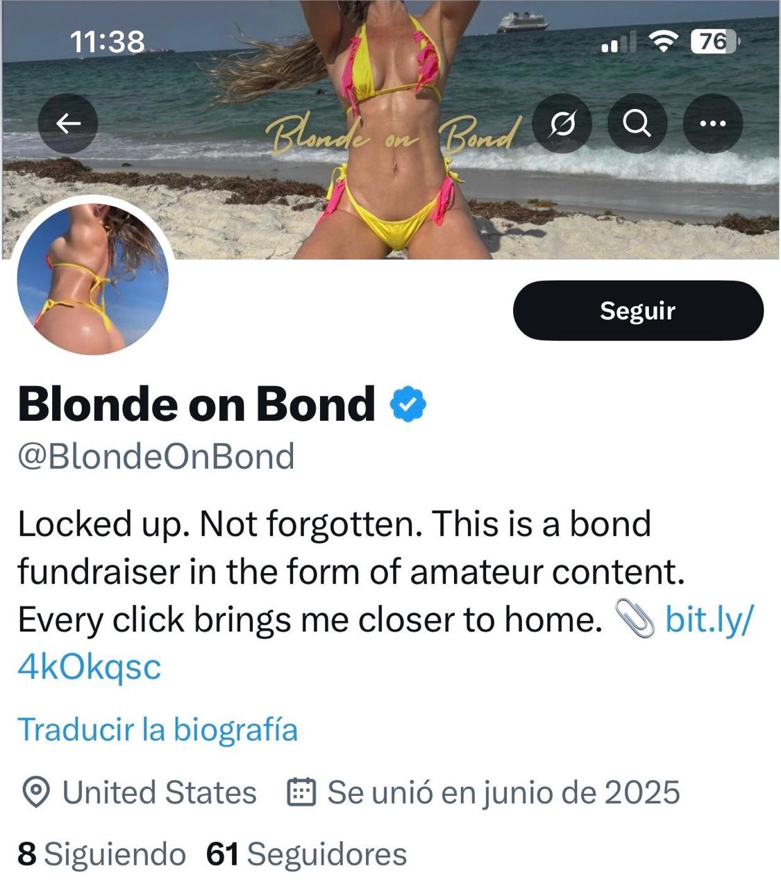 En su perfil de X, la mujer se presenta con la frase: “Locked up. Not forgotten. This is a bond fundraiser in the form of amateur content. Every click brings me closer to home” (Encerrada. Pero no olvidada. Esta es una recaudación de fondos en forma de contenido amateur. Cada clic me acerca más a casa).