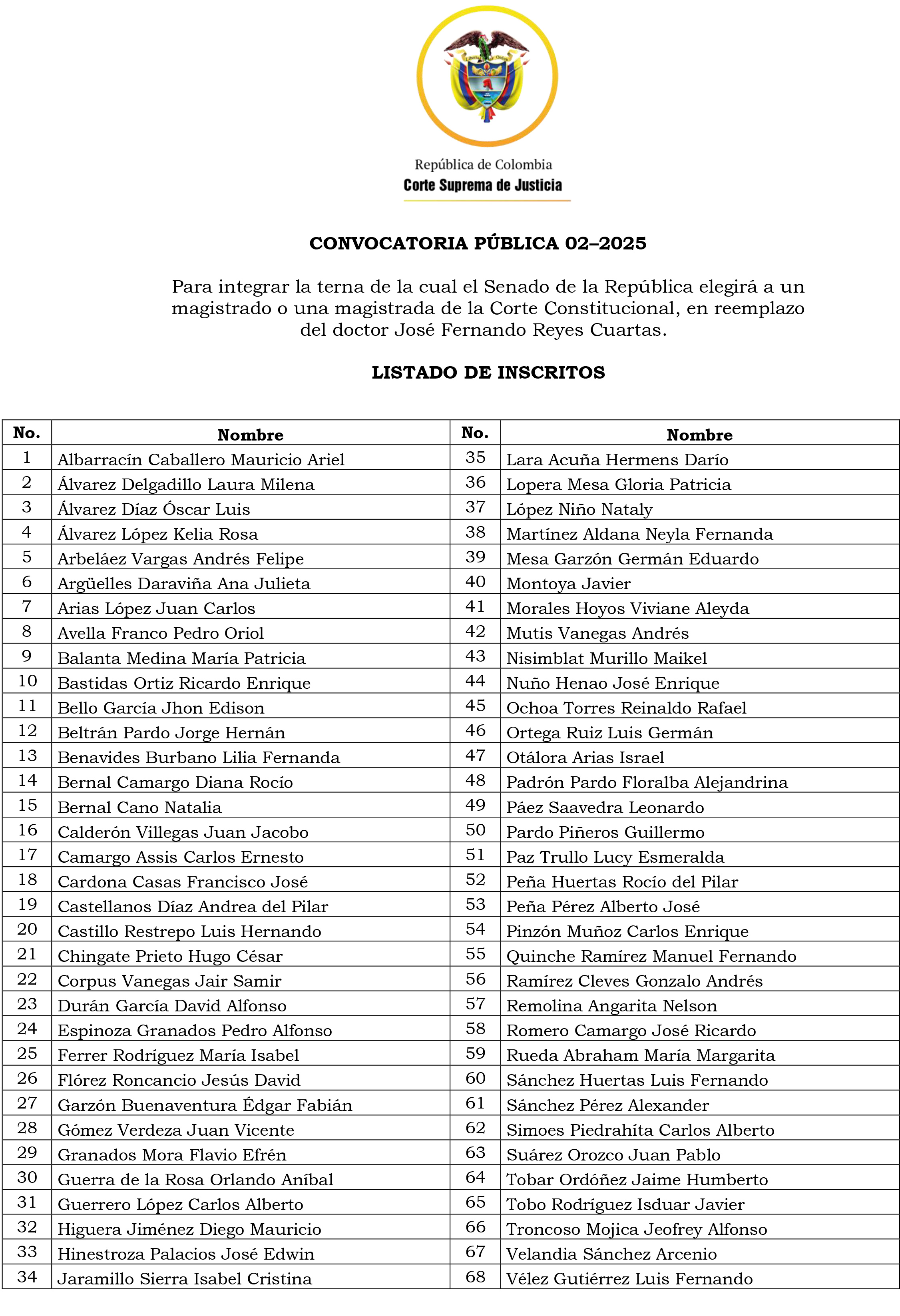 Un total de 68 personas se inscribieron en la Convocatoria Pública 02 de 2025, cuyo objetivo es conformar la terna de la cual el Senado de la República elegirá al próximo magistrado o magistrada de la Corte Constitucional, en reemplazo de José Fernando Reyes Cuartas.