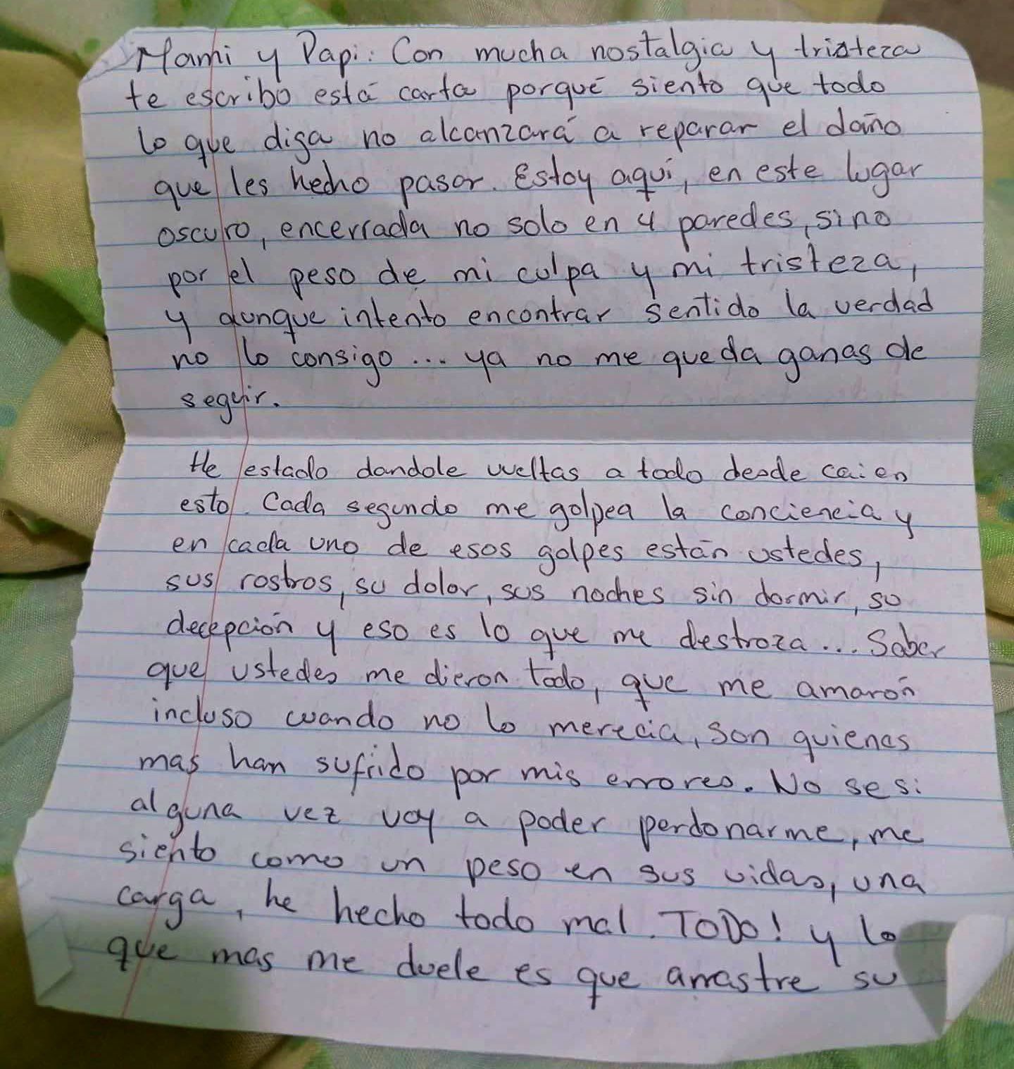 A raíz de la publicación del fallo, circuló en redes sociales un documento escrito a mano por la misma Merlys Oropeza, dirigido a sus padres.