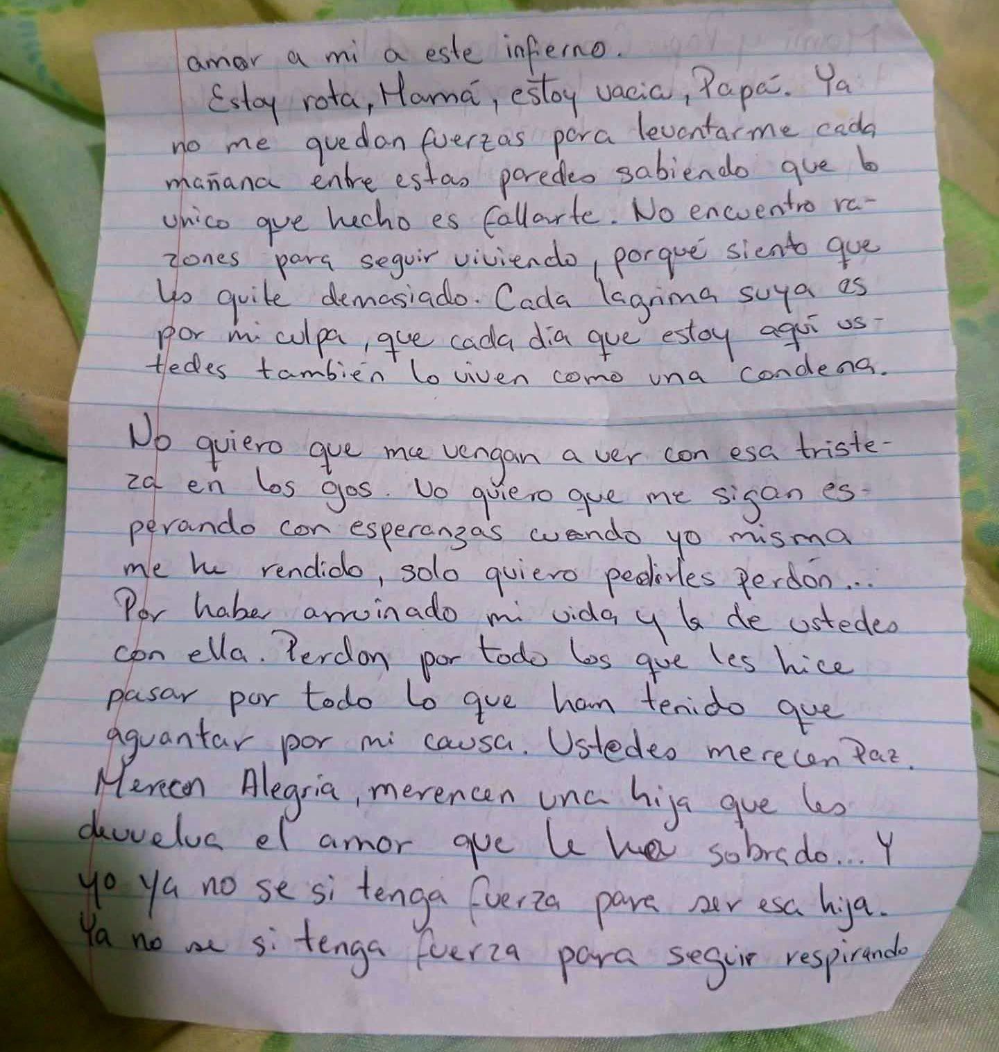 En dicha misiva, fechada en junio de 2025, la joven manifiesta las repercusiones emocionales de su reclusión. “Con mucha nostalgia y tristeza te escribo esta carta porque siento que todo lo que diga no alcanzará a reparar el daño que les he hecho pasar”, expresa uno de los apartes. También señala el desgaste físico y mental derivado de su situación carcelaria, al afirmar: “Ya no me quedan fuerzas”.