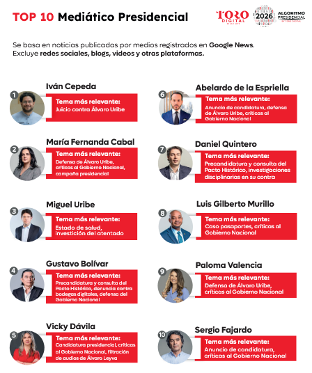 El informe también revela quiénes lideran las búsquedas en Google: Iván Cepeda, Vicky Dávila, María Fernanda Cabal, Abelardo de la Espriella y Miguel Uribe aparecen como los más consultados en el motor de búsqueda, lo que refleja su protagonismo en la conversación pública.