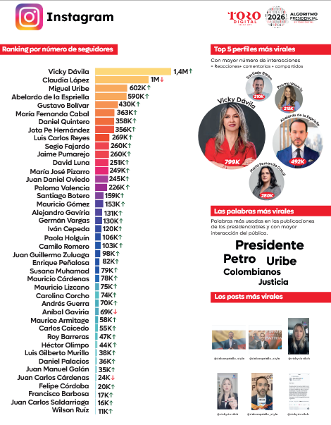 - En TikTok, Vicky Dávila alcanzó 280 mil seguidores y Santiago Botero llegó a 1.6 millones, mientras que en Instagram, María Fernanda Cabal tuvo 1.1 millones de seguidores y Dani Quintero llegó a 2 millones, siendo las cuentas con más seguidores y mayor interacción.