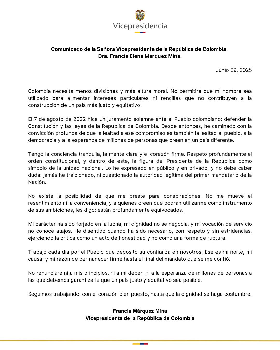 Finalmente, Francia Márquez reiteró que continuará en su labor como vicepresidenta hasta el final del mandato, con el objetivo de aportar a la construcción de un país más equitativo. “Seguimos trabajando, con el corazón bien puesto, hasta que la dignidad se haga costumbre”, concluyó en su mensaje, citado por El País y compartido desde su cuenta oficial.
