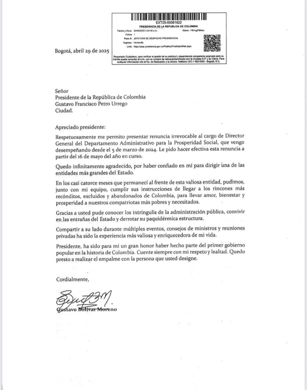 En la carta, Bolívar hizo un balance de su gestión y resaltó el trabajo realizado junto a su equipo para llevar la oferta institucional a las zonas más apartadas del país. “En los casi catorce meses que permanecí al frente de esta valiosa entidad, pudimos cumplir sus instrucciones de llegar a los rincones más recónditos”, afirmó. También ofreció su disposición para realizar el proceso de empalme con quien será su sucesor.
