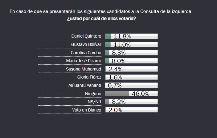 Figuran además nombres como María José Pizarro, Iván Cepeda, Roy Barreras y Susana Muhamad, aunque en menores proporciones, reflejando un escenario amplio y competitivo.