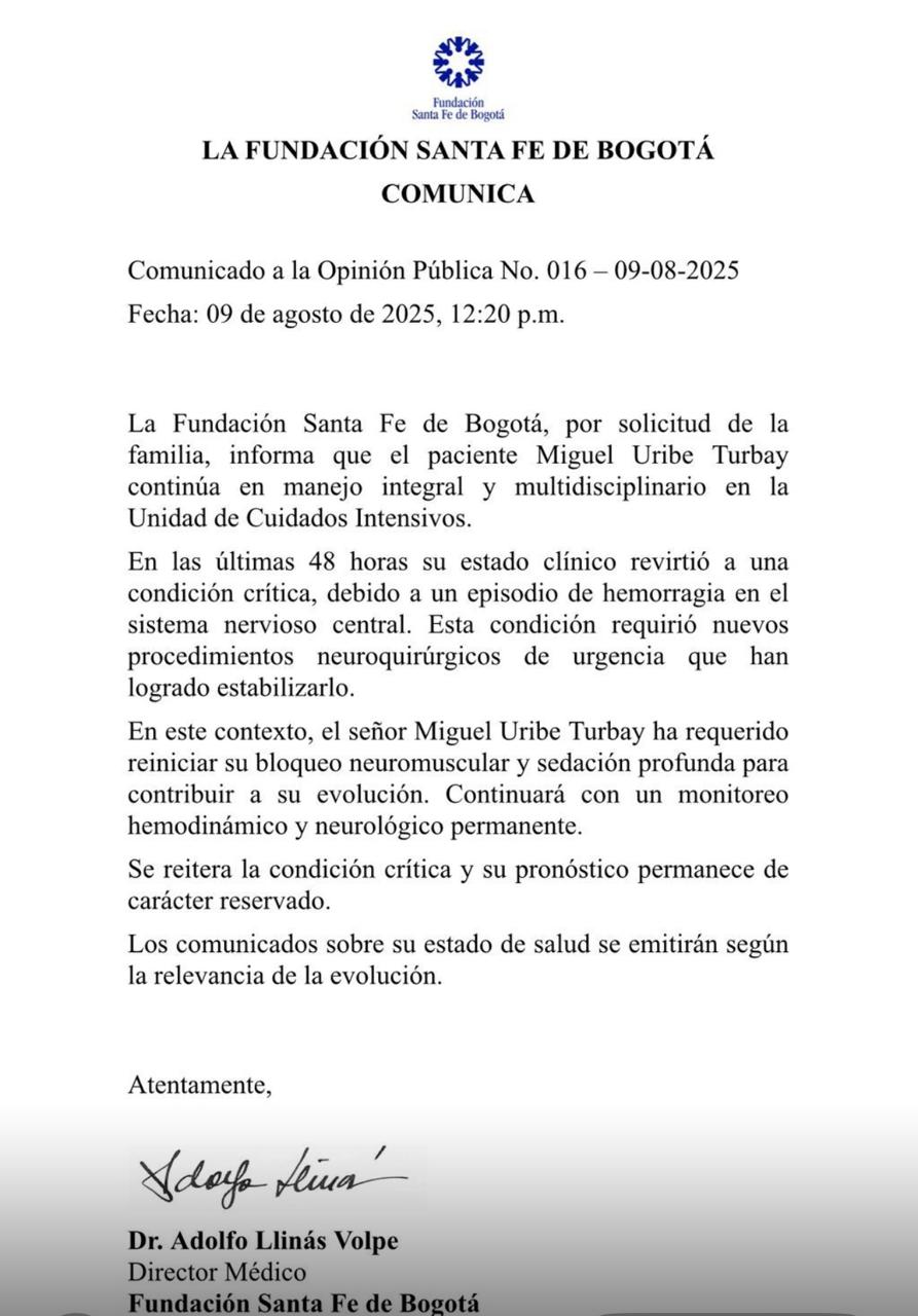 La Fundación Santa Fe de Bogotá informó este sábado que el exsenador y exsecretario de Gobierno de Bogotá, Miguel Uribe Turbay, continúa bajo manejo integral y multidisciplinario en la Unidad de Cuidados Intensivos, luego de que en las últimas 48 horas su estado clínico se deteriorara a raíz de un episodio de hemorragia en el sistema nervioso central.