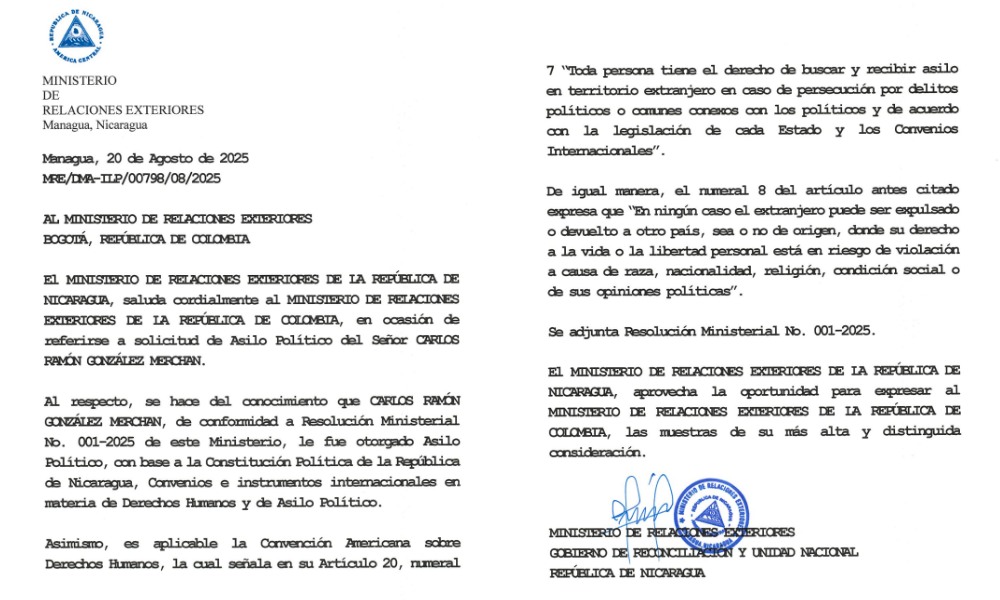 “Asimismo, es aplicable la Convención Americana sobre Derechos Humanos, la cual señala en su Artículo 20, numeral 7: ‘Toda persona tiene el derecho de buscar y recibir asilo en territorio extranjero en caso de persecución por delitos políticos o comunes conexos con los políticos y de acuerdo con la legislación de cada Estado y los Convenios Internacionales’”, se lee en la carta enviada por Nicaragua al Gobierno colombiano.