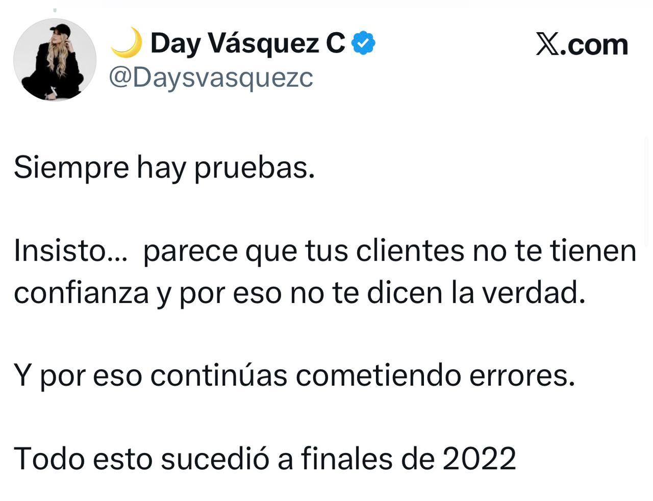 Junto a los mensajes publicados, Day Vásquez añadió una serie de comentarios en los que cuestiona el comportamiento de su exesposo.