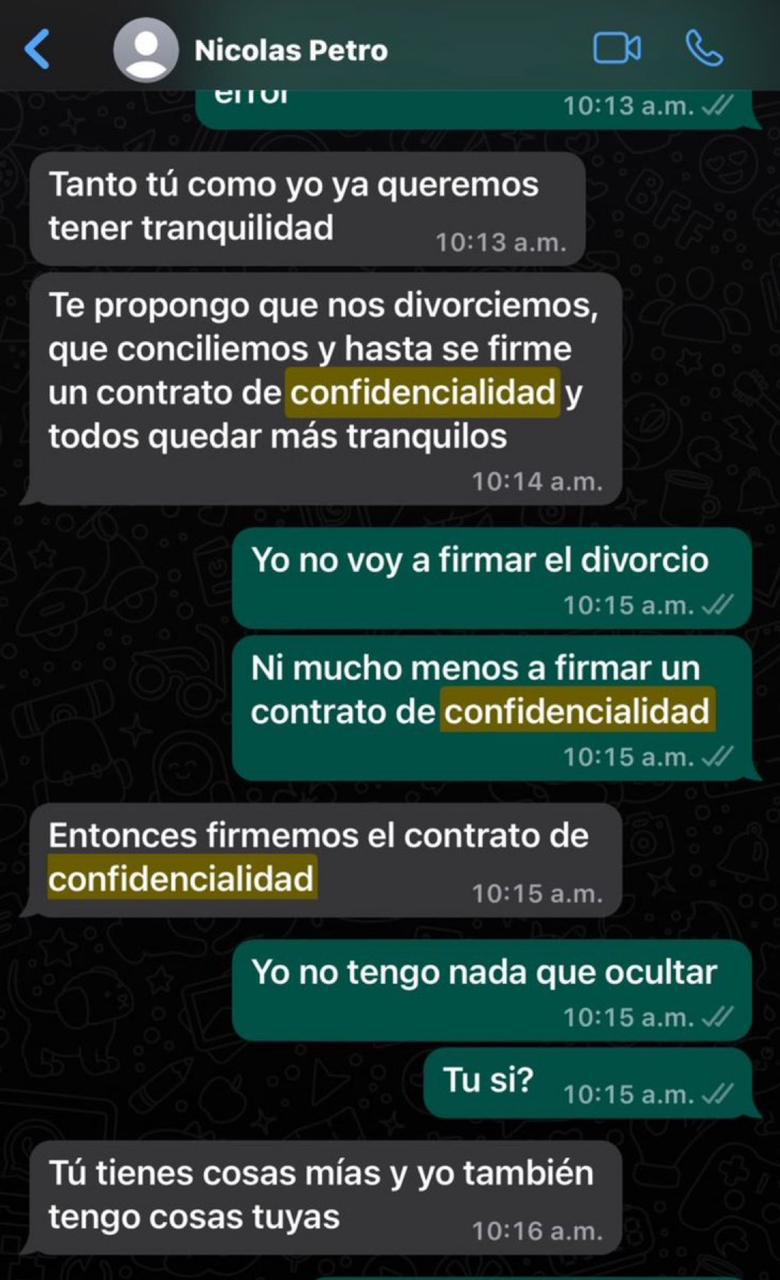 En uno de los mensajes, él plantea que ambos anhelaban “tranquilidad”, sugiriendo un divorcio formal, una conciliación y un contrato de confidencialidad.
