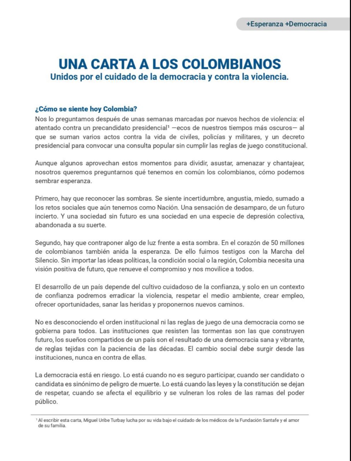 En sus apartes finales, la carta abierta convoca a la ciudadanía a unirse en defensa de la democracia y a transformar la actual sensación de angustia en una construcción colectiva de esperanza.