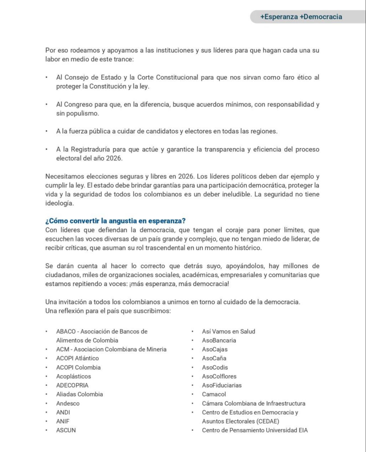Entre los firmantes se encuentran entidades como la Asociación de Bancos de Alimentos (ABACO), la Asociación Colombiana de Minería (ACM), la Asociación Nacional de Empresarios (ANDI), la Asociación Bancaria (Asobancaria), la Asociación Colombiana de Cajas de Compensación (AsoCajas), la Asociación Nacional de Instituciones Financieras (ANIF), la Asociación Colombiana de Universidades (ASCUN), así como gremios de sectores como la infraestructura, la salud, los plásticos, los alimentos y las fiduciarias. También suscriben centros de pensamiento y universidades.
