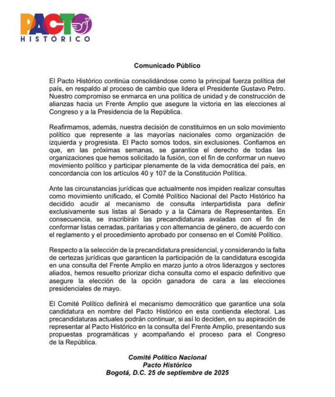 El Comité Político definirá el mecanismo democrático que garantice una sola candidatura en nombre del Pacto Histórico en esta contienda electoral. Las precandidaturas actuales podrán continuar, si así lo deciden, en su aspiración de representar al Pacto Histórico en la consulta del Frente Amplio, presentando sus propuestas programáticas y acompañando el proceso para el Congreso