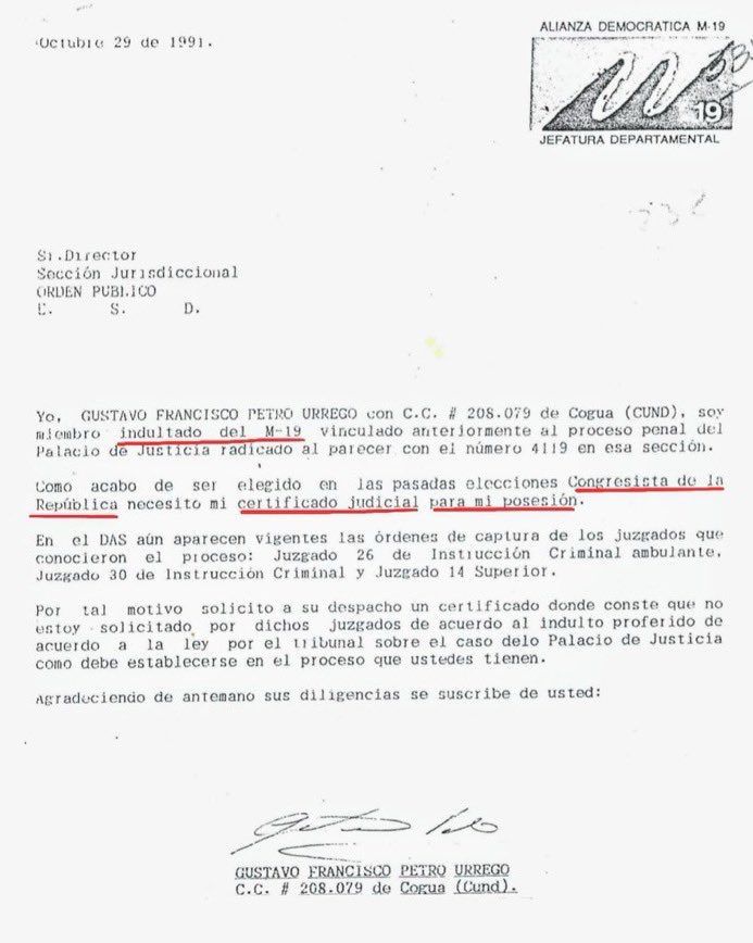 Según la carta, Petro solicitó al director de la Sección Jurisdiccional del Orden Público un certificado judicial, indicando que necesitaba demostrar que, pese a estar vinculado a un proceso penal por su vinculación al M‑19 y al caso del Palacio de Justicia, había sido indultado, por lo que no tenía órdenes de captura vigentes. Está impresa en papel membretado de la Alianza Democrática M‑19, y menciona su vinculación al proceso penal número 419.