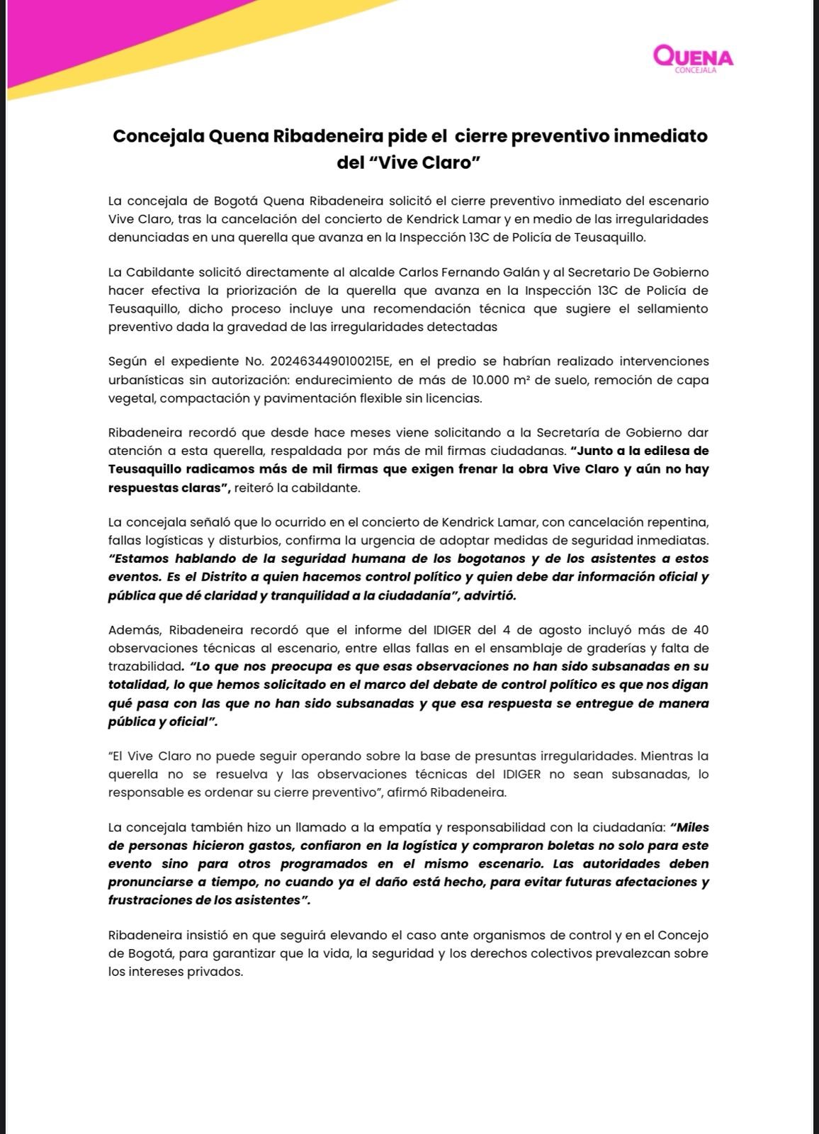 La concejala Quena Ribadeneira presentó una querella en la que señala presuntas irregularidades técnicas y administrativas, entre ellas intervenciones urbanísticas no autorizadas como el endurecimiento y pavimentación de más de 10.000 metros cuadrados de suelo sin licencias. “Más de mil firmas respaldan la solicitud de frenar la obra Vive Claro y aún no hay respuestas claras”, advirtió la cabildante, quien también recordó que un informe del Idiger con fecha del 4 de agosto encontró más de 40 observaciones pendientes, relacionadas con graderías, procesos de construcción y medidas de seguridad.