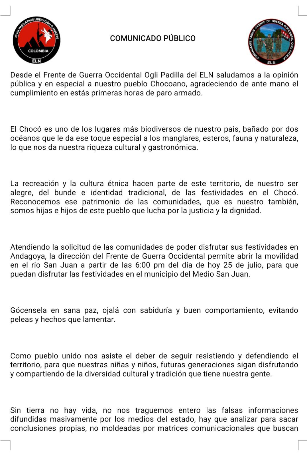 La declaración finaliza con una consigna insurgente —“¡Ni un paso atrás! ¡Liberación o muerte!”— y un mensaje para los habitantes de la región: “Felices fiestas para todo el pueblo chocoano”.