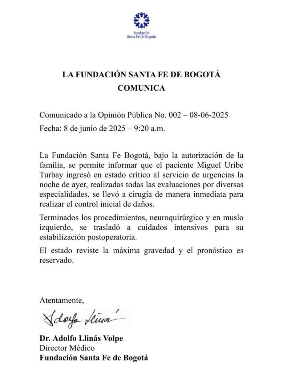 “La Fundación Santa Fe Bogotá, bajo la autorización de la familia, se permite informar que el paciente Miguel Uribe Turbay ingresó en estado crítico al servicio de urgencias la noche de ayer, realizadas todas las evaluaciones por diversas especialidades, se llevó a cirugía de manera inmediata para realizar el control inicial de daños.