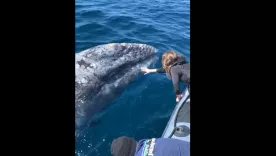 Impresionante acercamiento de una ballena gris a un barco de expedición