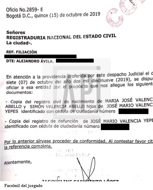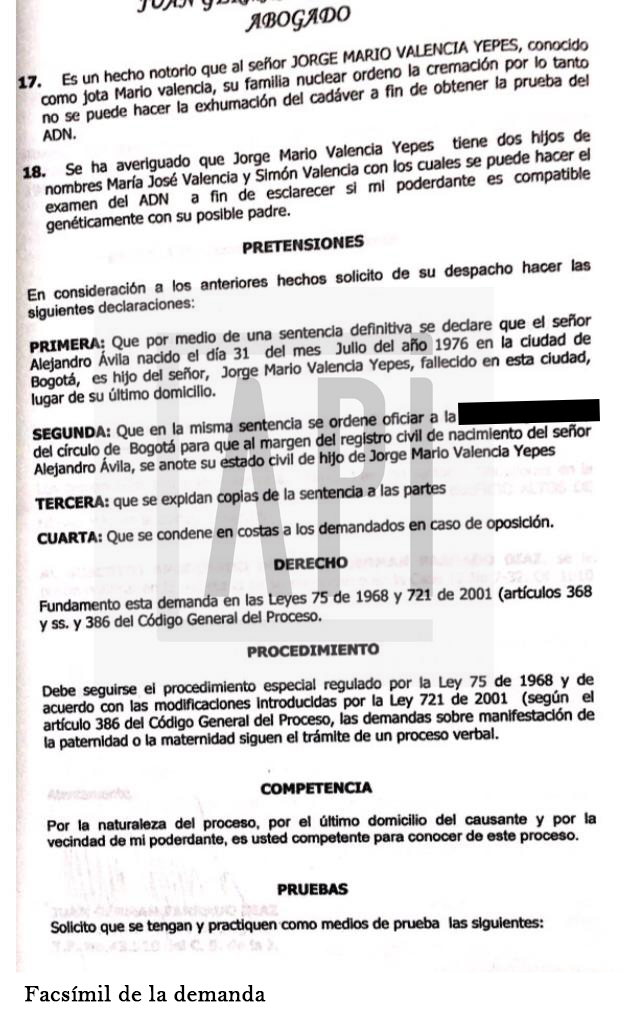 Alejandro Ávila, un hombre de 43 años de edad, domiciliado en Mosquera, Cundinamarca, a través de su abogado, radicó un proceso denominado de filiación posmortem. Mediante este, pretende que la justicia lo reconozca como el hijo mayor de Jota Mario Valencia y en consecuencia ampare los derechos que dice tener sobre la herencia en disputa.