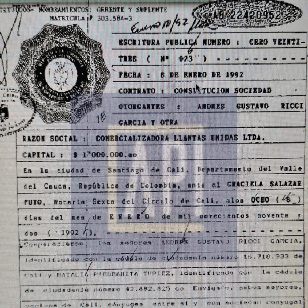 Aunque paradójicamente el documento de divorcio suscrito por la pareja Ricci Jaramillo en la Notaría Sexta de Cali el 29 de julio de 2017, en el numeral quinto se indicó que la sociedad conyugal no adquirió bienes muebles o inmuebles, el rastro empresarial parece concordar más con el inicio del escrito de la mujer, en la que indicó que éste era “intensamente rico”.