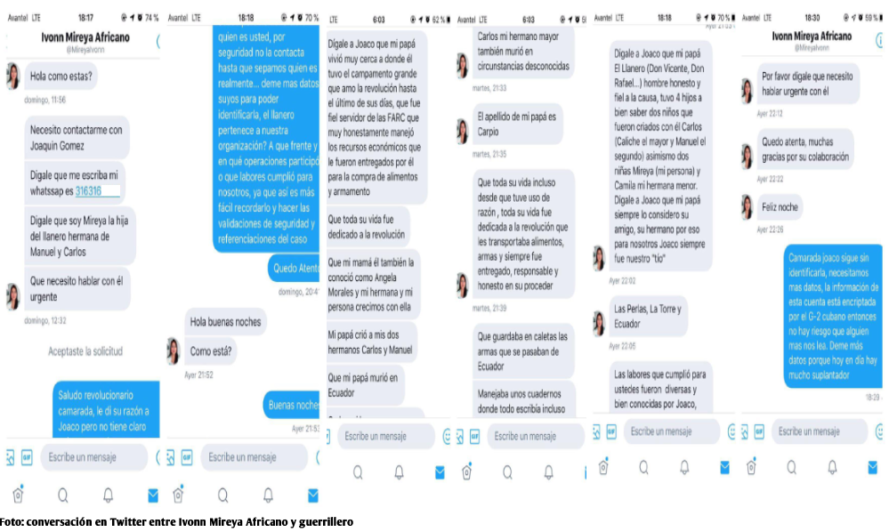 El envío de un mensaje en twitter a Rodrigo Londoño, conocido como Timochenko, máximo líder del antiguo grupo guerrillero, hoy convertido en el movimiento político, Fuerzas Armadas Revolucionarias del Común, Farc, causó revuelo en la red social el pasado 25 de abril. Aunque fue un mensaje directo, es decir entre dos usuarios de Twitter; este se hizo público. “ ¿Hola cómo estás?, necesito comunicarme con Joaquín Gómez, dígale que soy Mireya la hija del llanero, hermana de Manuel y Carlos, que necesito hablar con él urgentemente”. Así inició la conversación Ivonn Mireya Africano Mancuase, una mujer de 33 años que actualmente vive en Pasto, Nariño.