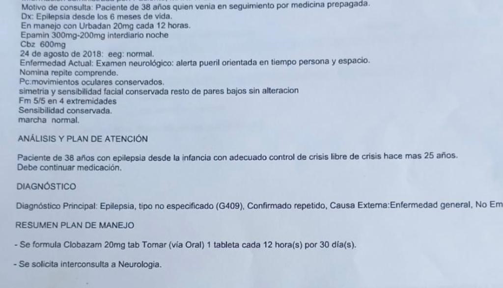 Con otro detalle, autoriza a contar el drama de su hija y su historia clínica: “Paciente de 38 años con epilepsia desde la infancia con adecuado control de crisis libre de crisis hace más de 25 años. Debe continuar medicación.