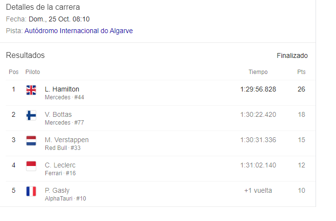 Dentro de la tabla general de puntaje, Hamilton lídera con 26 puntos y Bottas está seguido con 18 puntos, lo que le da una amplia ventaja para obtener el gran Campeonato. Le sigue en el tercer lugar Verstappen con 15 puntos y Lecler con 12.