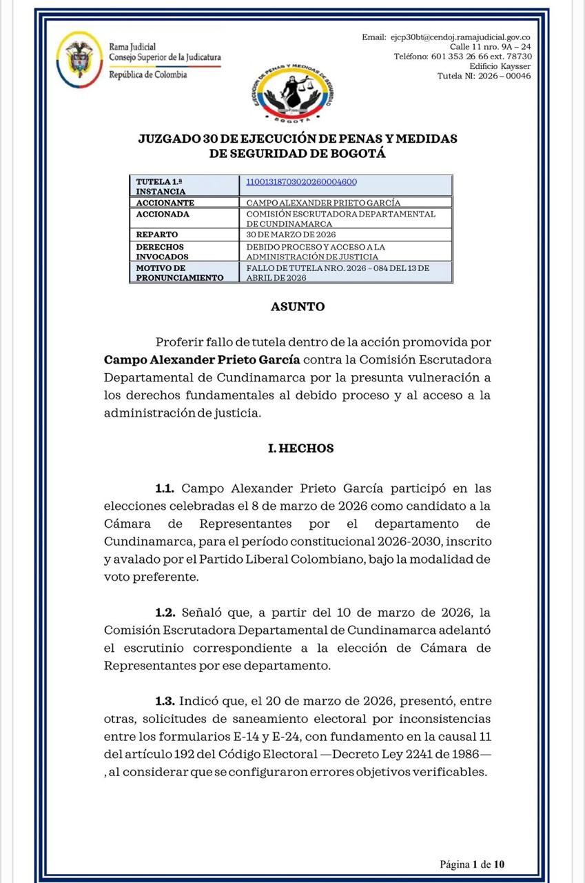Un juez de ejecución de penas de Bogotá declaró improcedente la acción de tutela presentada por el excandidato a la Cámara de Representantes por Cundinamarca, Campo Alexander Prieto García, quien alegaba vulneración de sus derechos fundamentales al debido proceso y al acceso a la administración de justicia en el marco del escrutinio electoral de las elecciones legislativas del 8 de marzo de 2026.