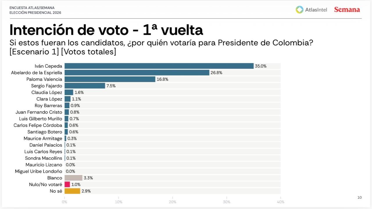 Nueva encuesta presidencial AtlasIntel: Cepeda lidera, Paloma Valencia y De la Espriella disputan el segundo lugar