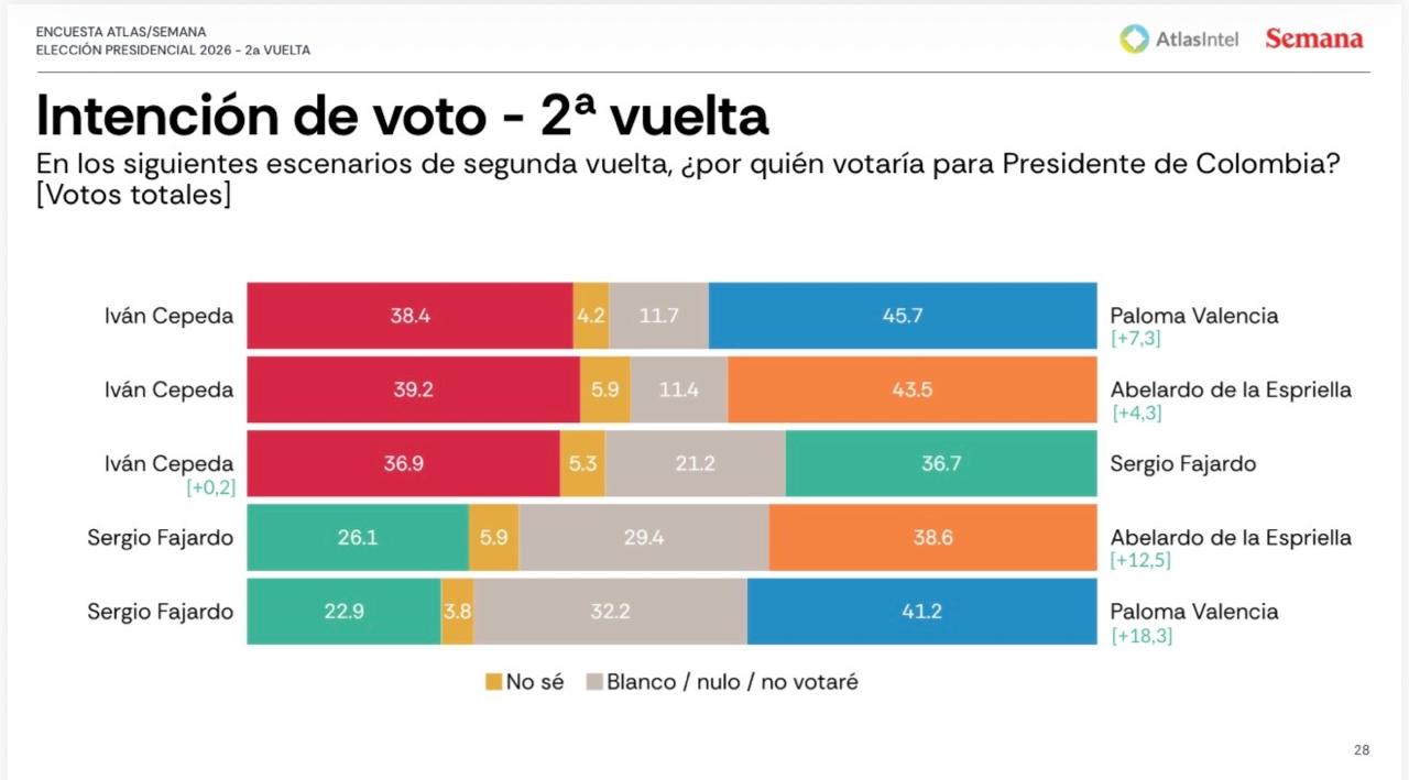 La encuesta también midió posibles enfrentamientos en segunda vuelta presidencial. En un escenario entre Iván Cepeda y Paloma Valencia, la senadora obtendría 45,7 % frente a 38,4 % de Cepeda, mientras 11,7 % votaría en blanco o no votaría y 4,2 % no sabe.