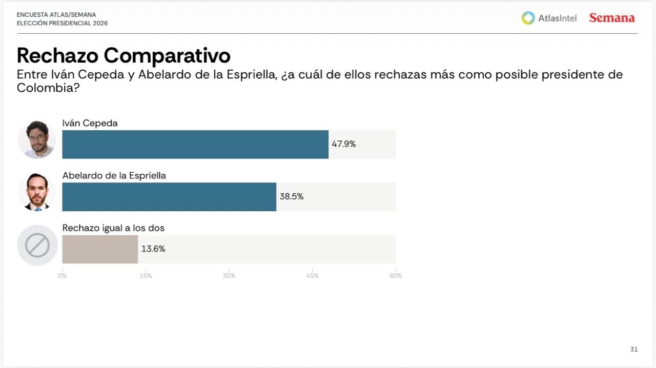 Ante la pregunta de cuál de los dos sería más rechazado como presidente, 47,9 % de los encuestados afirmó rechazar más a Iván Cepeda, mientras 38,5 % dijo rechazar más a Abelardo de la Espriella. Un 13,6 % manifestó rechazo igual hacia ambos.