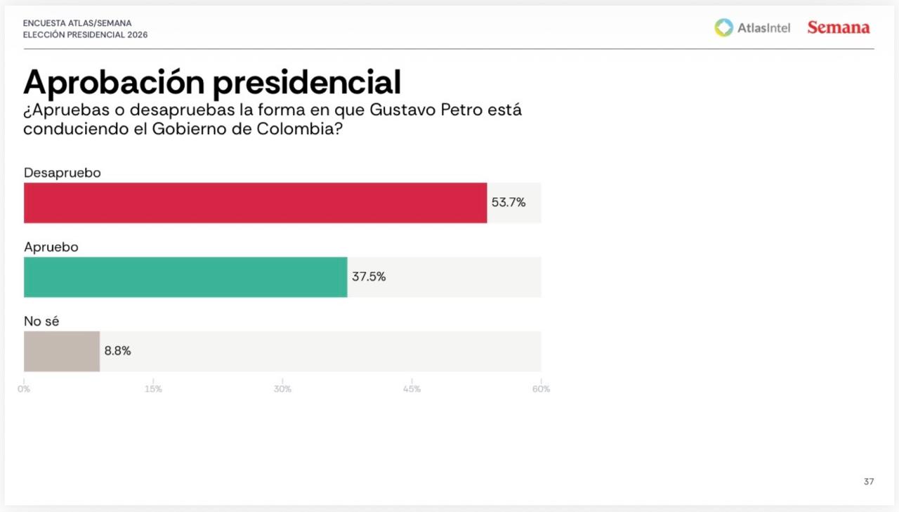 La aprobación del presidente Gustavo Petro se ubica en un 37.5% de los encuestados. Gráfico tomado de Encuesta presidencial AtlasIntel 2026