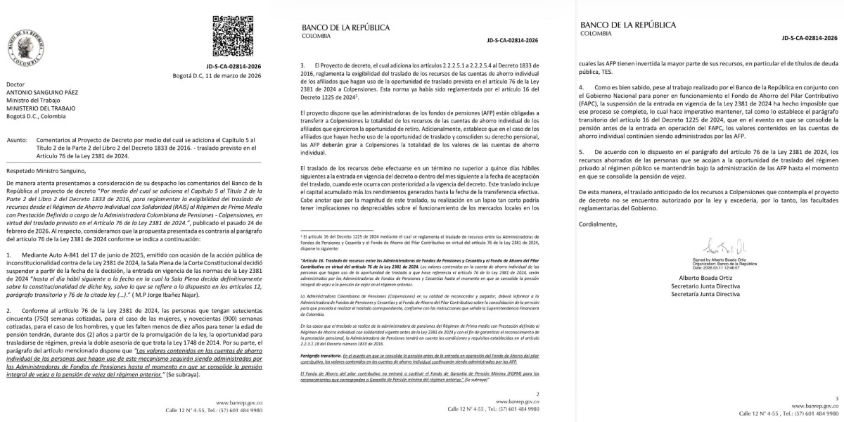El documento, fechado este 11 de marzo y firmado por el secretario de la Junta Directiva del Emisor, Alberto Boada Ortiz, analiza el alcance del proyecto normativo que pretende reglamentar el artículo 76 de la Ley 2381 de 2024. Esta disposición abrió una ventana para que ciertos afiliados se trasladen de régimen pensional, pero estableció condiciones específicas sobre el manejo de los recursos.