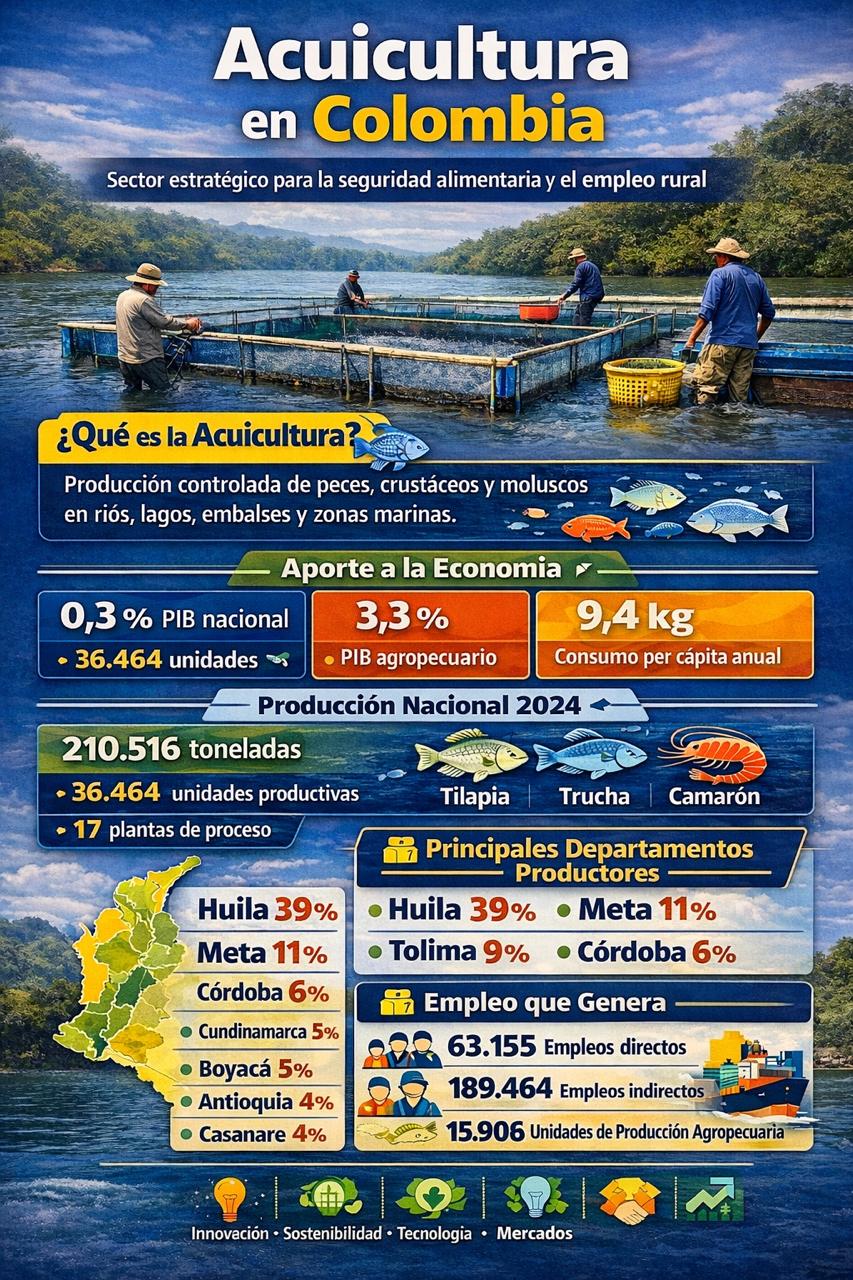 La acuicultura dinamiza la economía colombiana con 63.155 empleos directos y 189.464 indirectos, así como con cifras determinantes en comercio exterior: 16.955 toneladas en 2024 de tilapia, trucha y camarón de cultivo.
