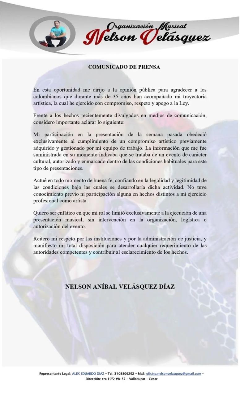 En un comunicado oficial, Velásquez indicó que su actuación fue gestionada por su equipo de trabajo y que, al momento de aceptar el contrato, se le informó que el evento contaba con los permisos correspondientes.