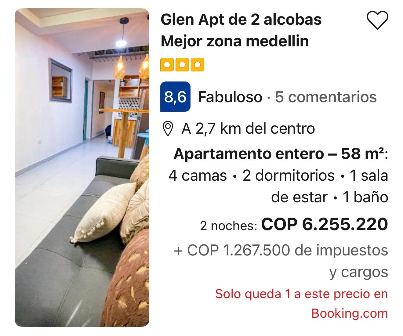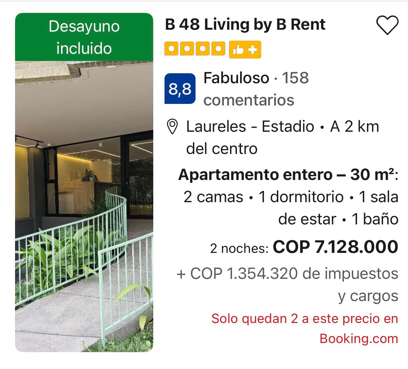 Un monitoreo realizado este viernes en Booking.com demuestra que algunos hospedajes en zonas como Laureles–Estadio superan los 15 millones de pesos por dos noches, mientras que otros apenas ofrecen una o dos habitaciones disponibles a precios rebajados.