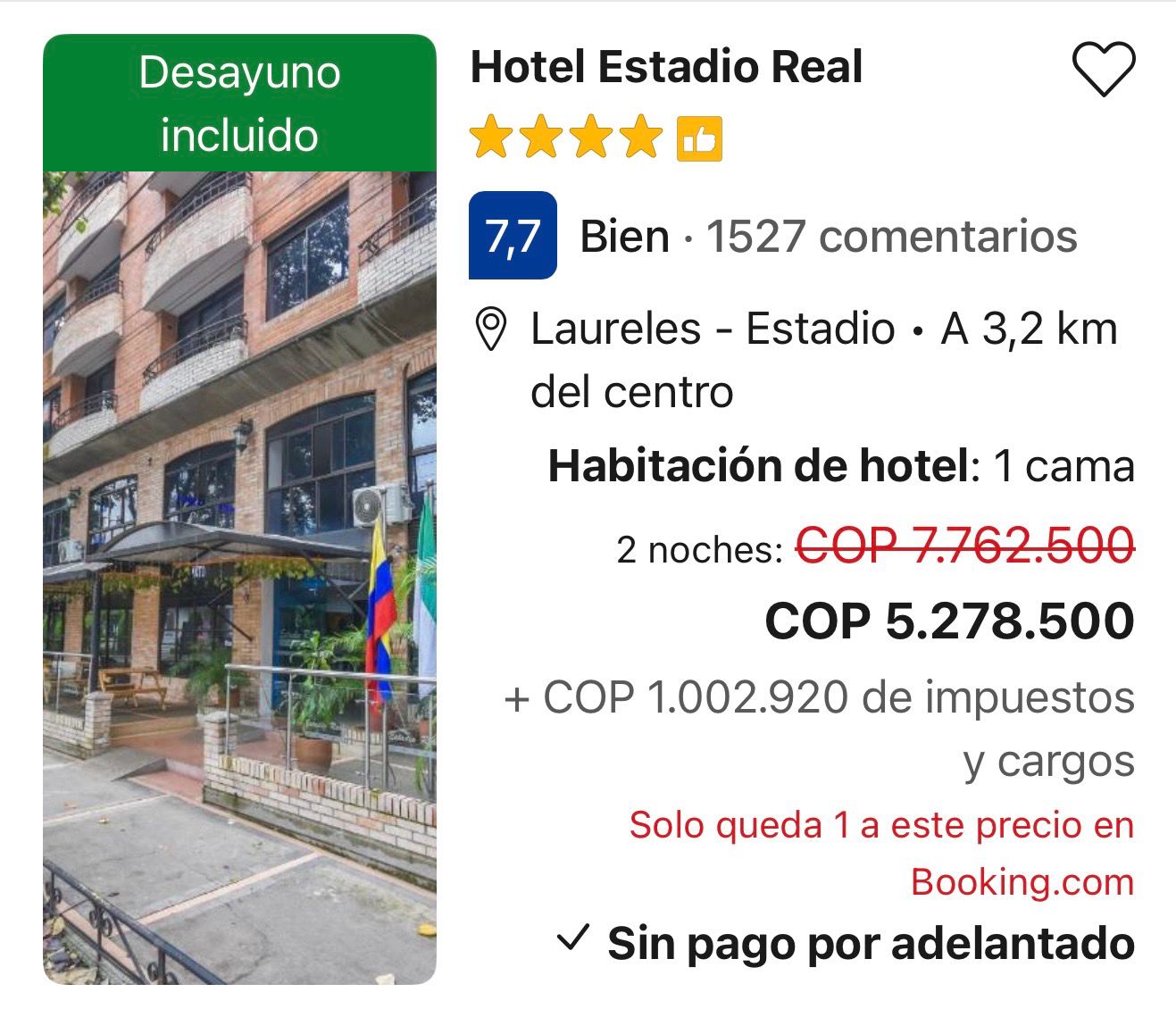Por ejemplo: Hotel Estadio Real (Laureles, 3,2 km del centro): $5.278.500 + $1.002.920 = $6.281.420