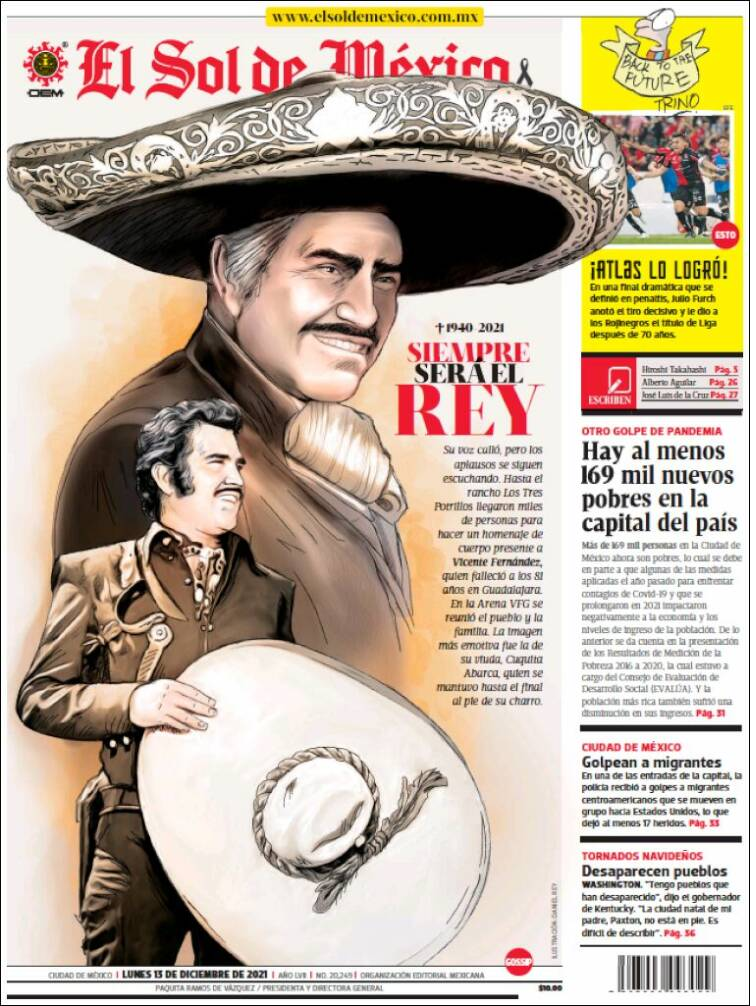 Un día después de la noticia del cantante mexicano, las portadas de los periódicos latinoamericanos dieron un espacio al astro de la música ranchera.