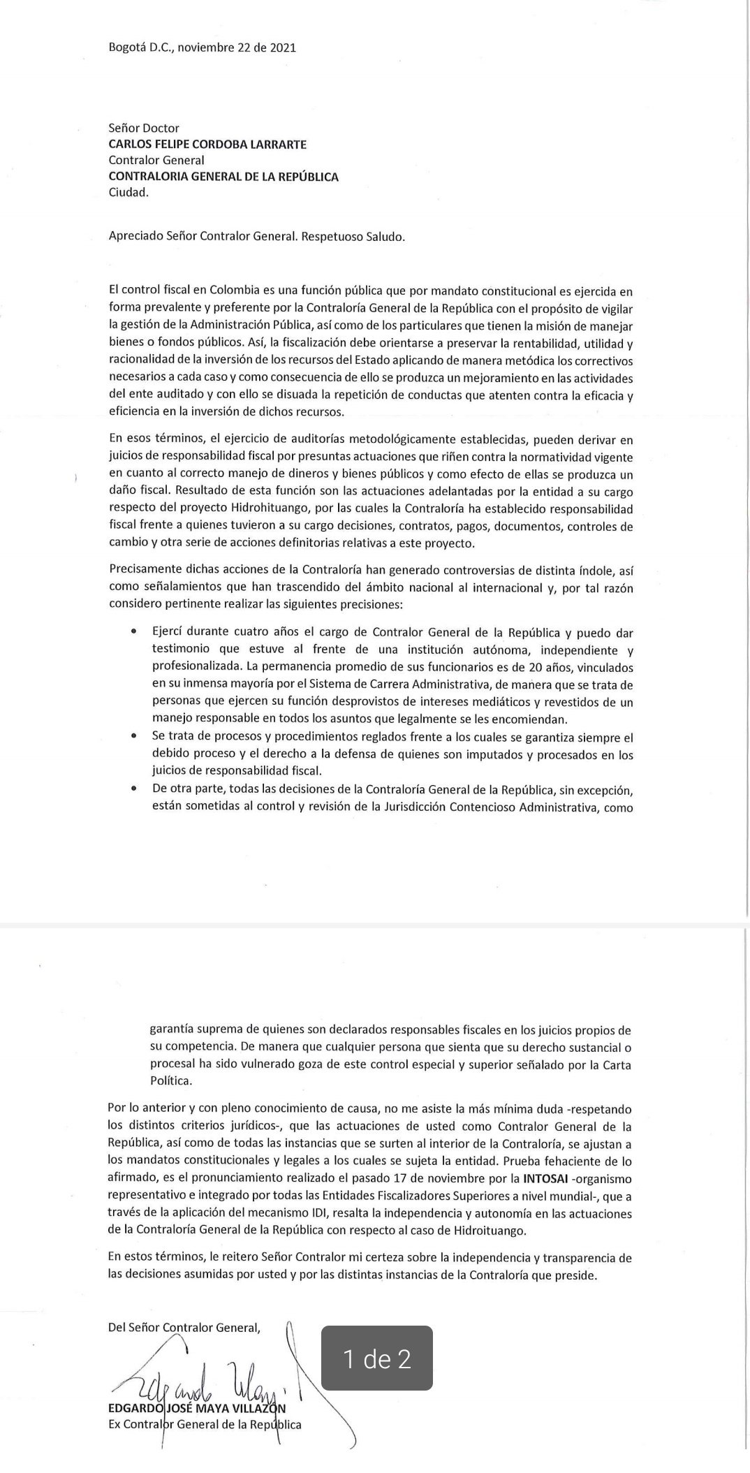 A su turno, el pasado 22 de noviembre, el excontralor Edgardo Maya, también respaldo a Córdoba en su decisión en el caso Hidroituango y expresó "el ejercicio de auditorías metodológicamente establecidas, pueden derivar en juicios de responsabilidad fiscal. Resultado de esta función son las actuaciones adelantadas por la entidad a su cargo respecto del proyecto Hidroituango. No me asiste la más mínima duda -respetando los distintos criterios jurídicos- que las actuaciones de usted como Contralor General de la República, se ajustan a los mandatos constitucionales y legales a los cuales se sujeta la entidad."