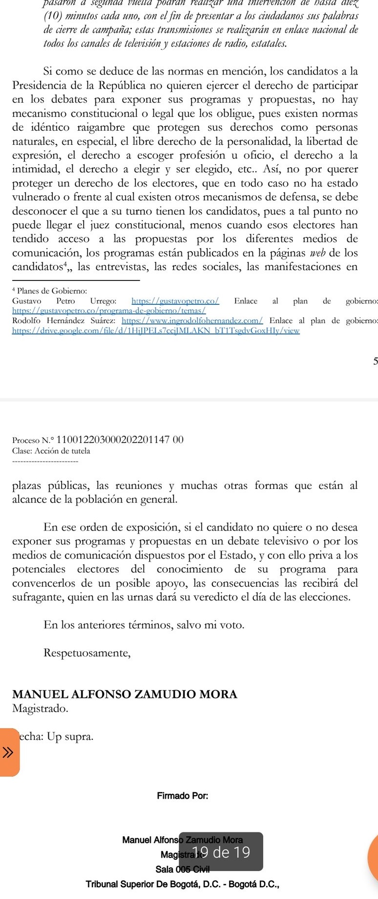 El magistrado continúa, en un documento de seis páginas, argumentando que “no hay mecanismo constitucional o legal que los obligue (a los candidatos presidenciales), pues existen normas de idéntico raigambre que protegen sus derechos como personas naturales”.