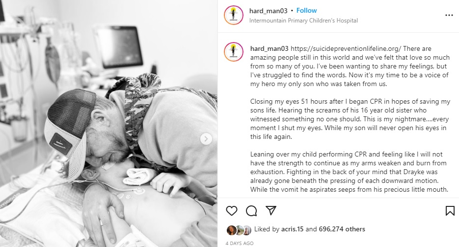 Sobre la muerte, el padre de Drayke, manifestó que la hermana de 16 años fue quien lo encontró sin vida. “Escuchar los gritos de su hermana que presenció algo que nadie debería. Esta es mi pesadilla... cada momento que cierro los ojos. Mientras que mi hijo nunca volverá a abrir los ojos en esta vida”.