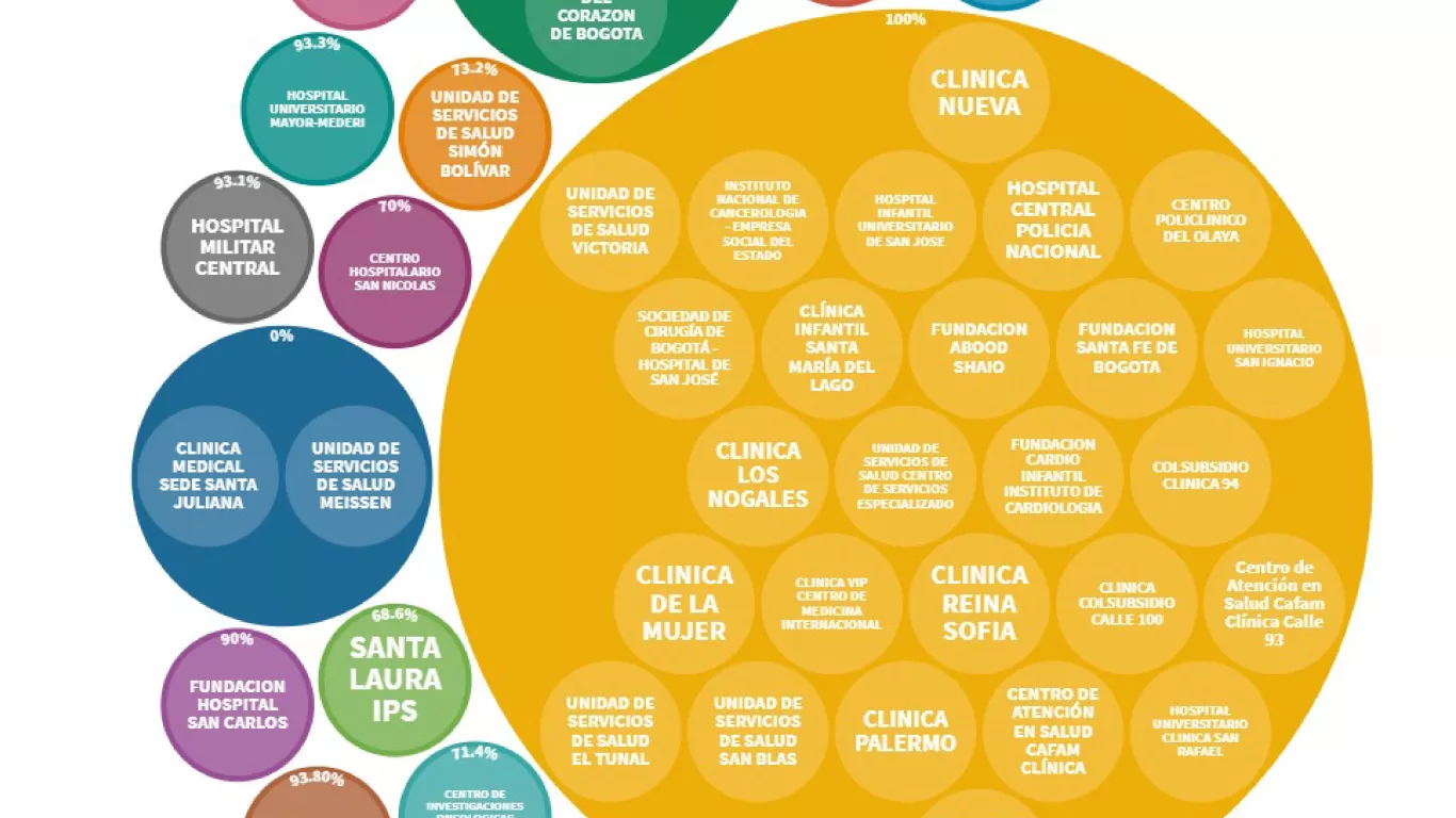 Por otro lado, las clínicas que tienen un rango de ocupación del 80% son la Clínica Juan N Corpas con un 86.7% y la Empresa Social del Estado Hospital Universitario de la Samaritana con un 85.7%. En las que reportan una ocupación del rango del 70% están con el 77.8% son la Administradora Clínica La Colina, García Pérez Medica y Compañía y el Instituto del Corazón de Bogotá; la Clínica Universitaria Colombia (75.8%), la Unidad de Servicios de Salud Simón Bolívar (73.2%), el Centro de Investigaciones Oncológicas Clínica San Diego Ciosad (71.4%) y el Centro Hospitalario San Nicolás (70%).