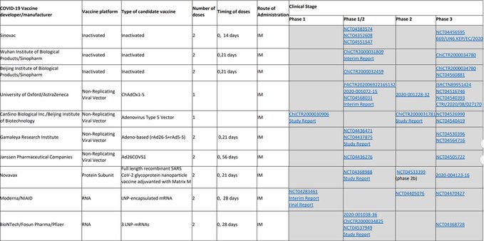 Según la Organización Mundial de la Salud, en este momento hay 151 proyectos de vacuna en evaluación preclínica, 41 en fases clínicas, de las cuales 10 están en fase 3, de estas 3 a partir de virus inactivados, 4 usando vector viral, 2 de ARN y una de proteínas.